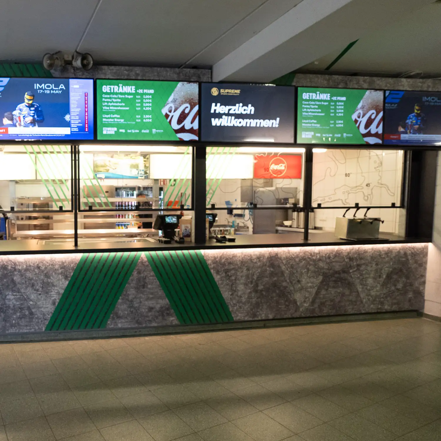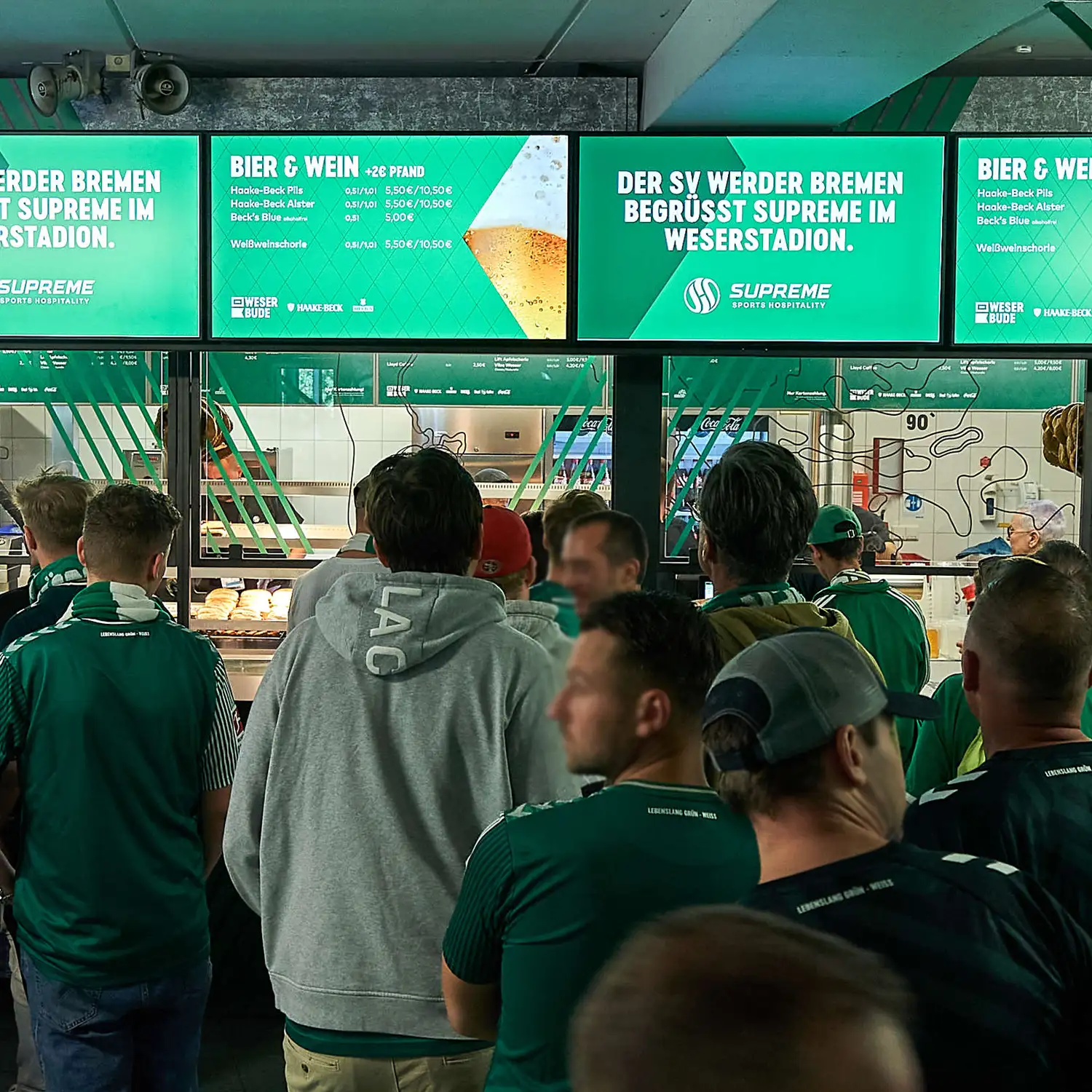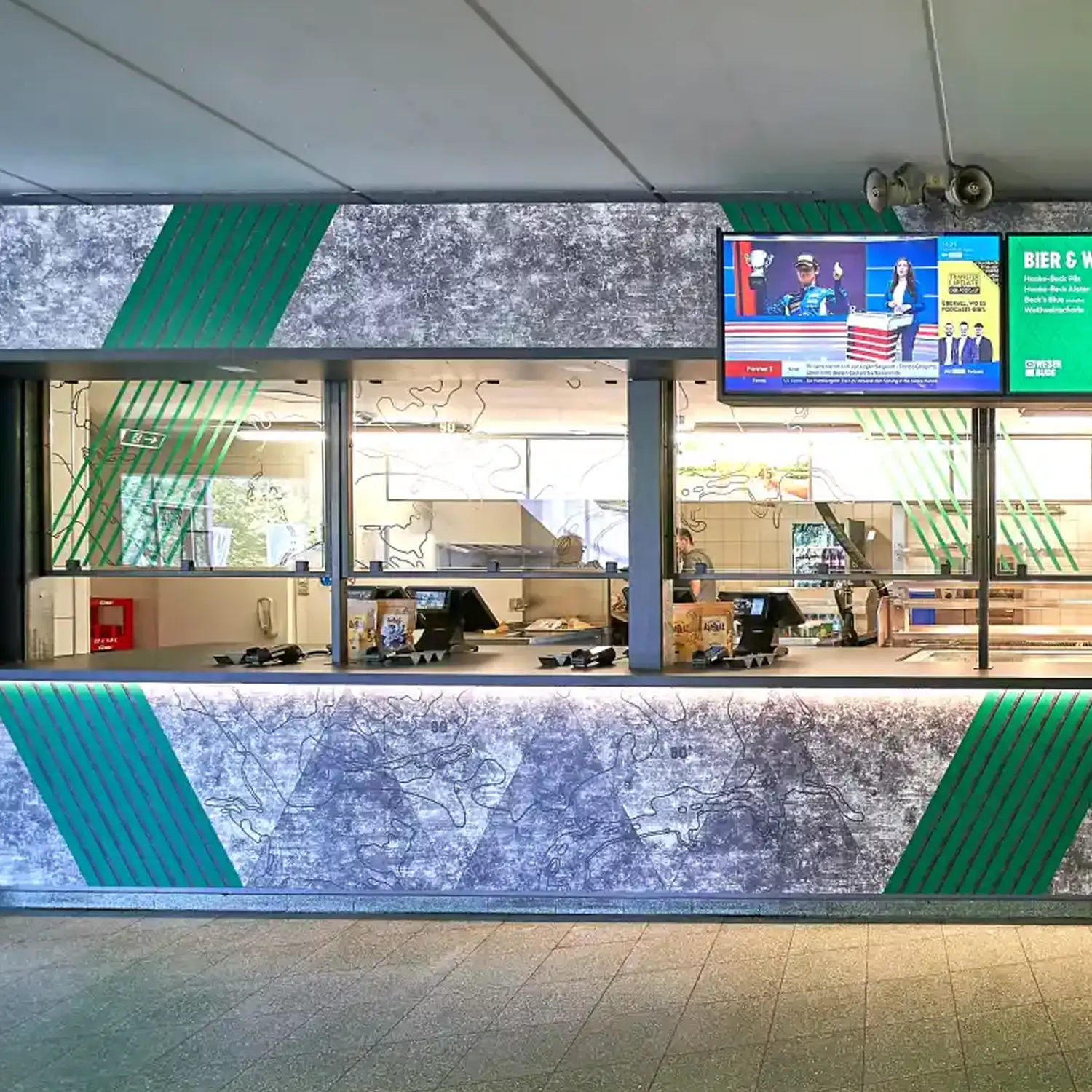 Architect GKAD en interieurbouwer Tenbrink werkten samen aan de vernieuwing van 17 kiosken en de VIP ingang van het Weserstadion. Het gewenste decor was echter niet in de juiste maat en kwaliteit beschikbaar, waardoor een beroep op onze expertise is gedaan. Het resultaat was een HR decor met de gewenste uitstraling en kwaliteit. De groene kleur werd exact afgestemd op de aangeleverde RAL-kleur en alle elementen samengevoegd tot een totaal ontwerp. Daarnaast zijn ook de glazen delen van de kiosken voorzien van een print op maat, wat zorgt voor een krachtig en uniform geheel.